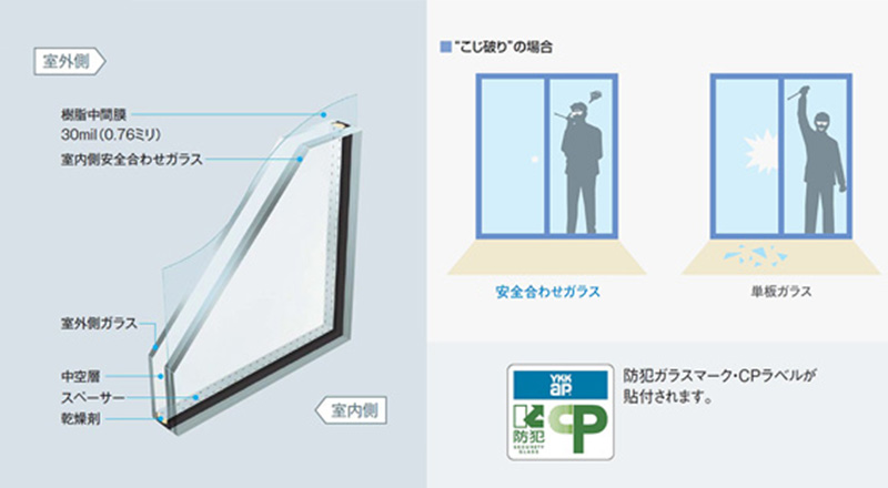 複層ガラスよりも破壊されにくい構造で単板ガラス(フロートガラス)に比べ、はるかに優れた防犯性能を持っています。